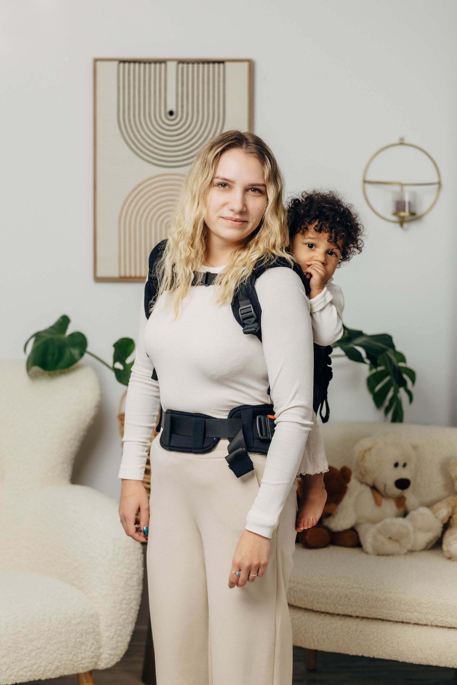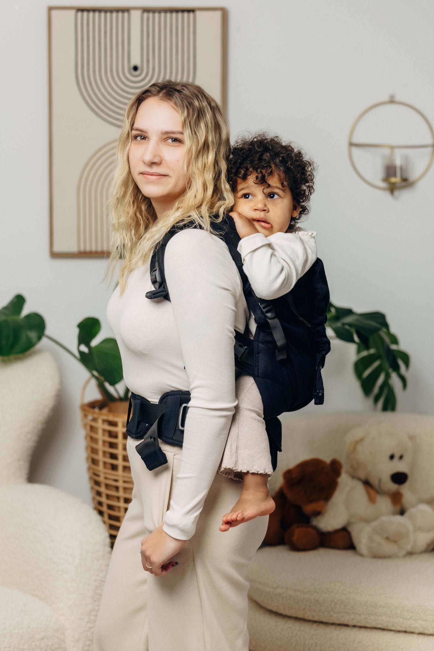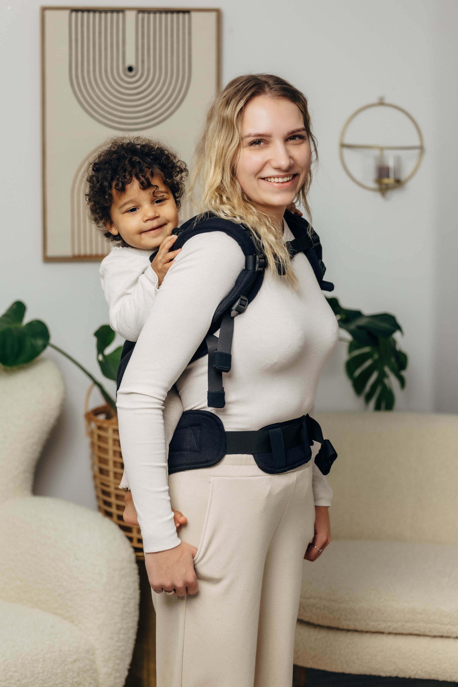 - Pannello e cinghie regolabili assicurano una vestibilità ergonomica in ogni fase sia per il bambino che per il genitore.